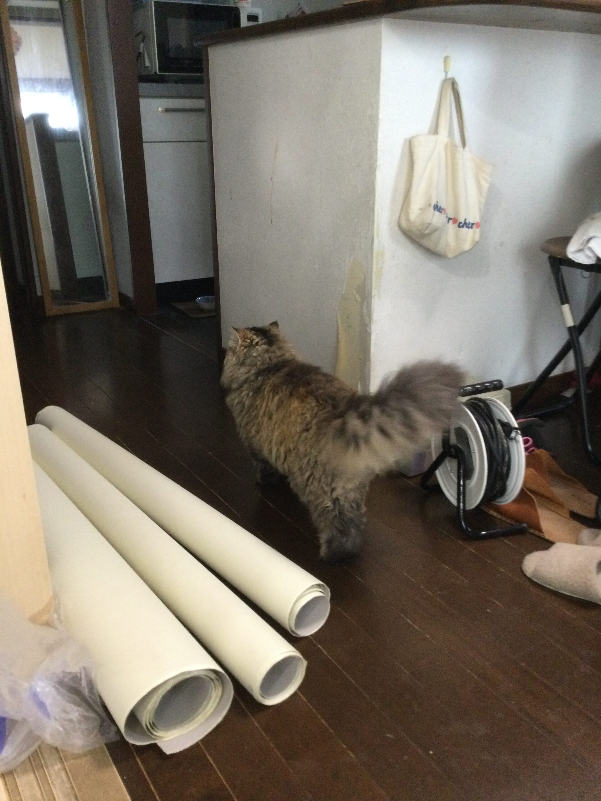 ペイントと同時進行で襖に壁紙を貼っていきました。
