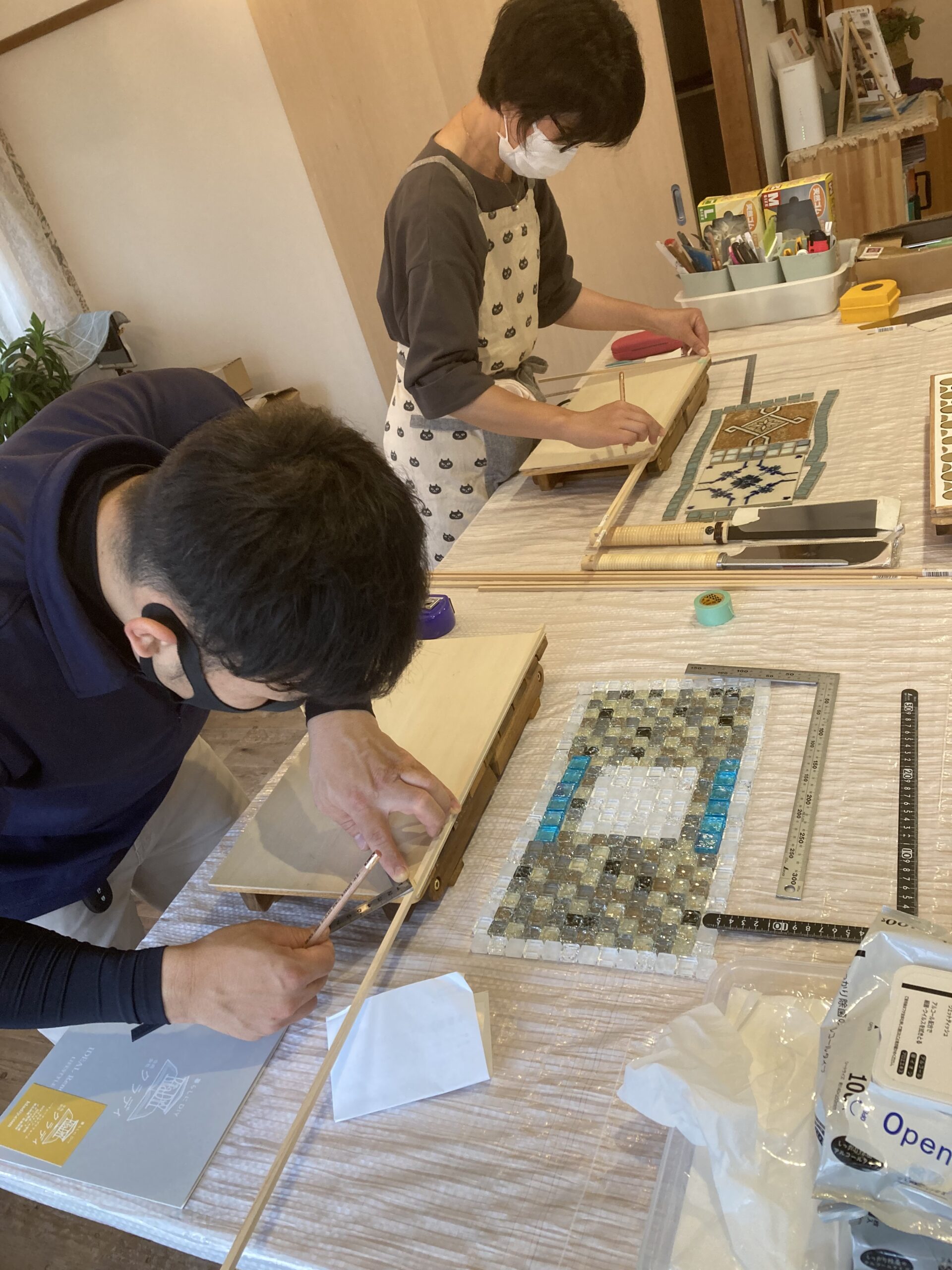 初日はタイルの貼り方などの説明と実際に小さな木製スタンに平面貼りの練習をしていただきました。タイルの種類があまりに豊富すぎて、レイアウト・割付の仕方に悩んでおられましたがお二人ともそれぞれの個性が引き出されているかのような素敵な色・柄を選んでレイアウトされていました。