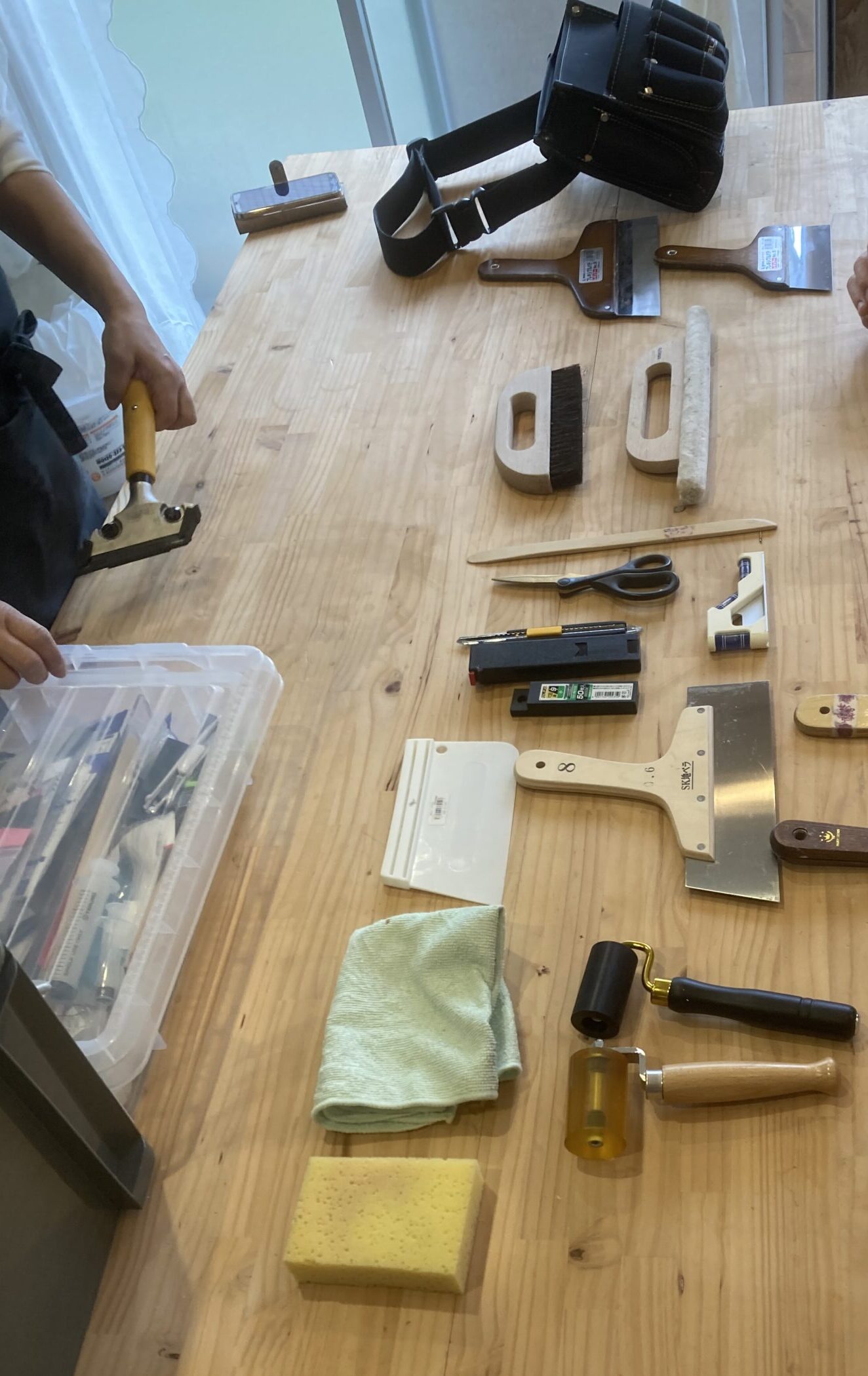 デザイン・レイアウト・接着剤、目地材の種類や工程等、まずは小さいもので学んでいきます。午後はダイノックシート貼り。初日の緊張と細かな作業に集中しているせいか、一日目はあっという間に終了…