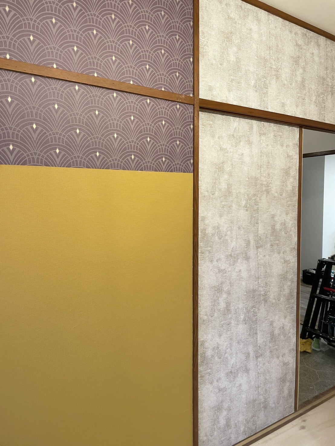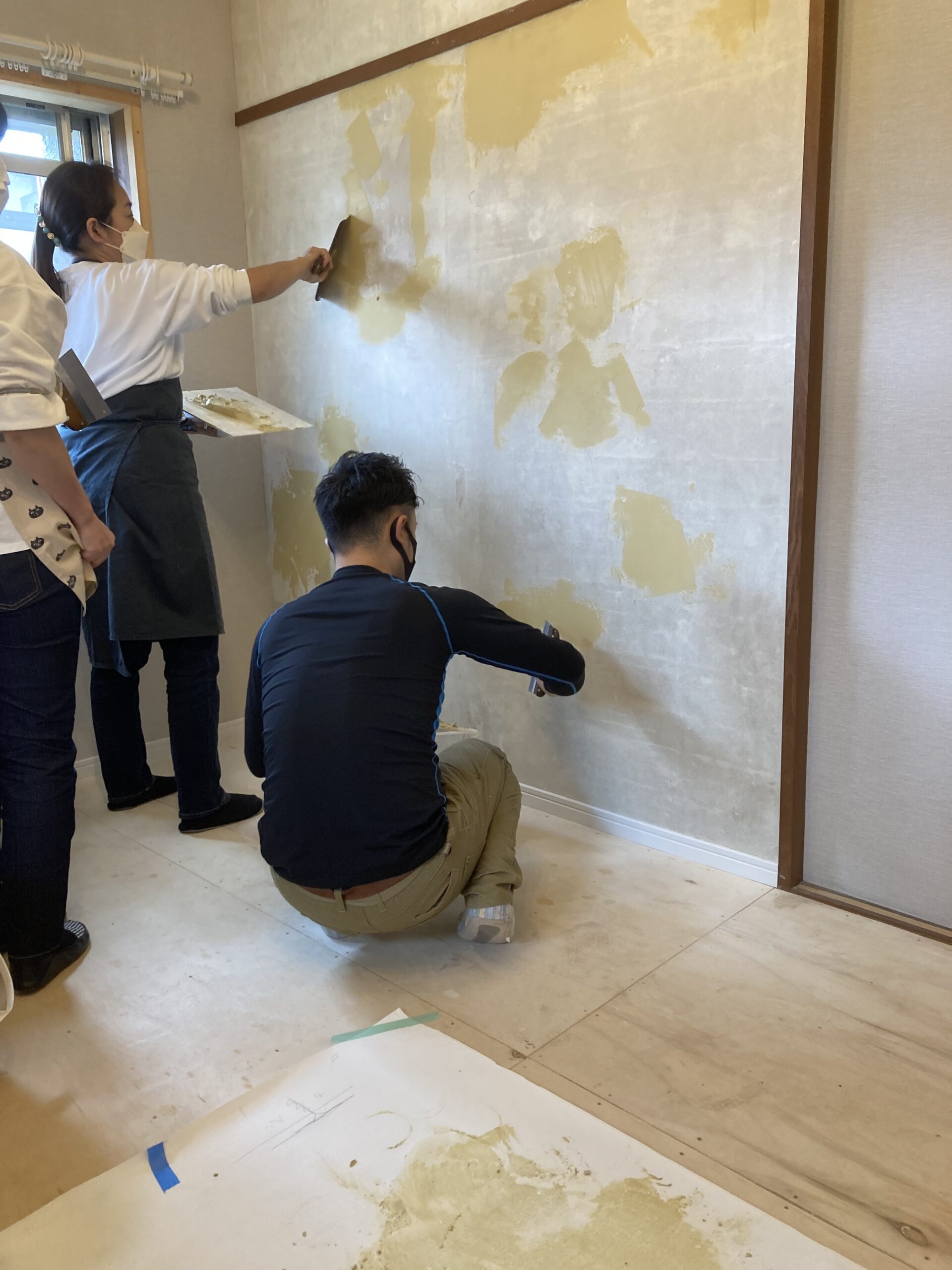 壁の一面を変えるだけでもかなり雰囲気が変わります。既存の壁紙はがし→パテつくり→パテ埋め→やすりかけ…下処理をしっかり施していよいよ壁紙貼りです。