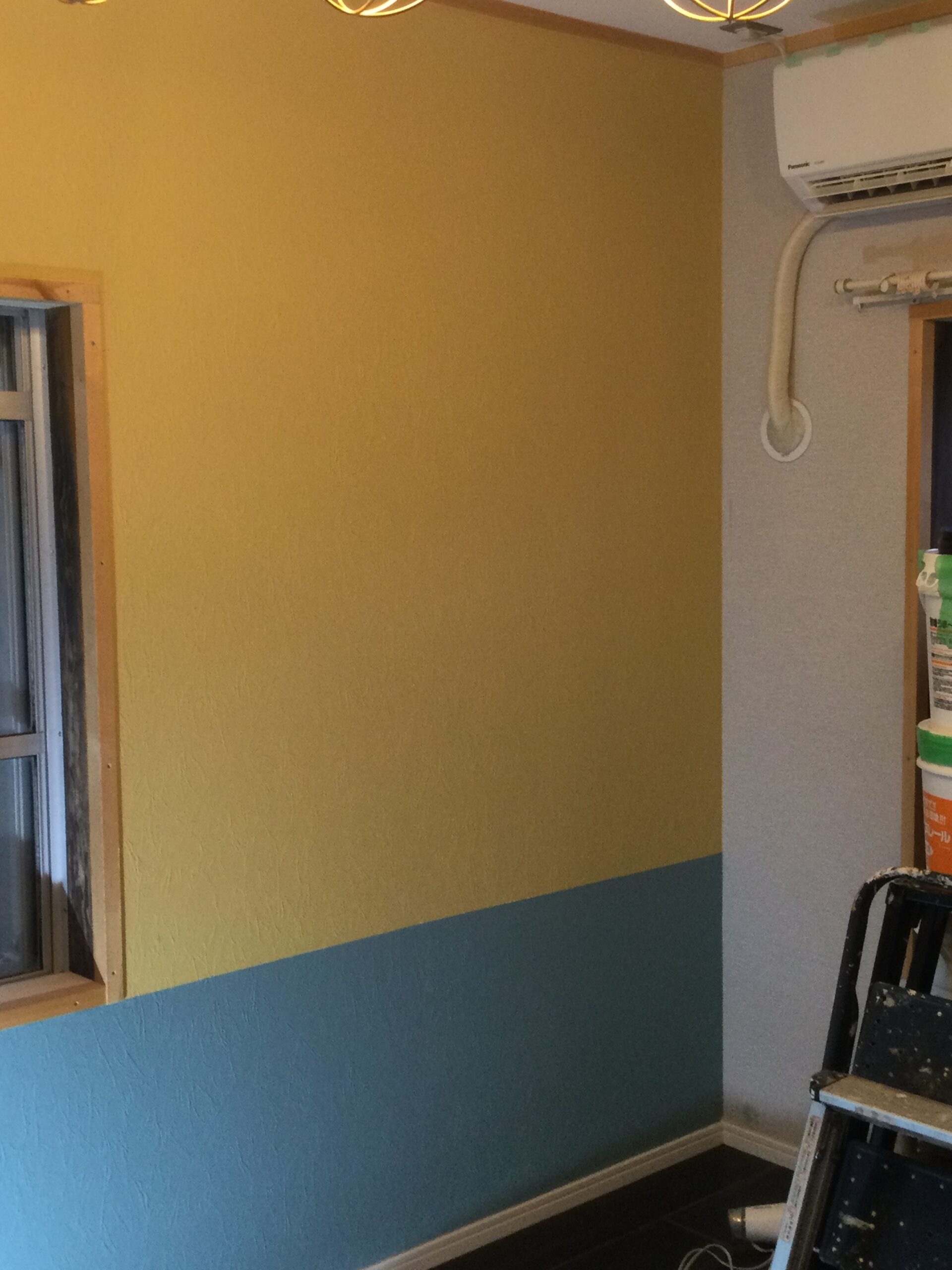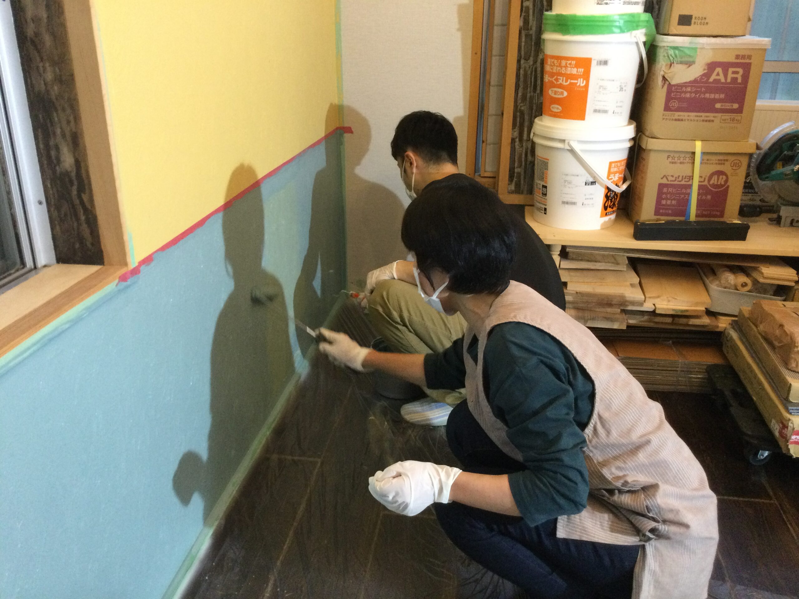 いよいよ昼食後は先日、フロアタイルを貼ったお部屋の一面の壁をペイントしていきますよ~