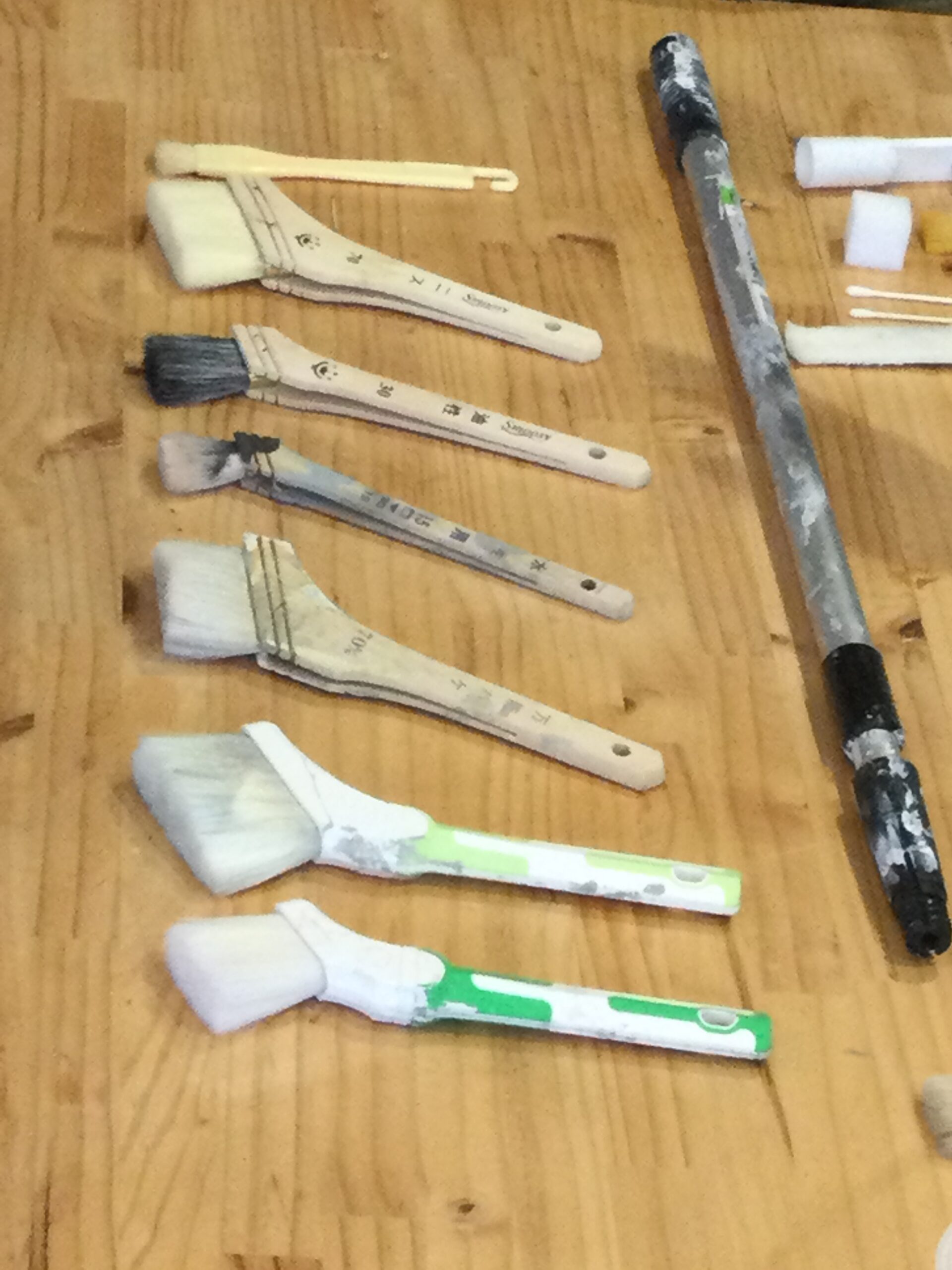 • 刷毛・・・筋交い・寸胴・平刷毛・塗料の種類別刷毛(ニス・鉄骨・水性等)人口刷毛(化学繊維)・動物由来刷毛(馬・豚・山羊)・パキンと呼ばれる植物から採取した繊維でできているものまで幅広くあります。