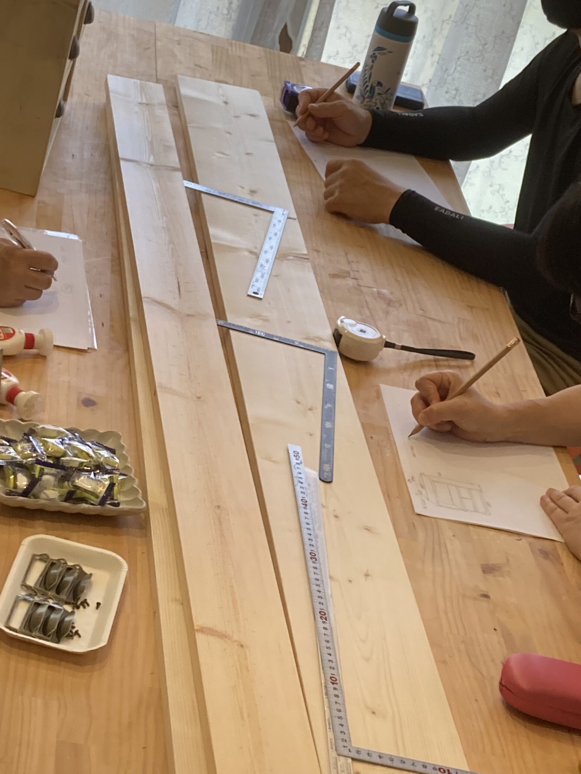 ①木取図の書き方②木材墨付け③材切断④組み立て、塗装までを行います。